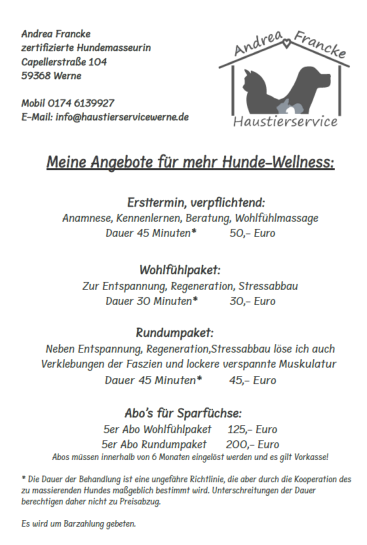 Warum Massage für Hunde?Durch die gezielte Berührung und sanfte Techniken löse ich Muskelverspannungen und fördere die Durchblutung Ihres Hundes. Die Massage unterstützt die Beweglichkeit, hilft bei der Regeneration nach körperlicher Aktivität und trägt zur allgemeinen Entspannung bei. Zusätzlich kann sie Stress und Nervosität reduzieren, indem sie beruhigend auf das Nervensystem wirkt. So fühlt sich Ihr Hund ausgeglichener und wohler im Alltag.